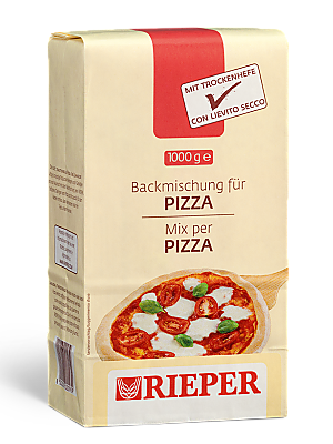 Pizza nach Belieben belegen und im vorgeheiztem Backofen auf 225 °C (Ober- u. Unterhitze) für ca. 25 Min. backen.